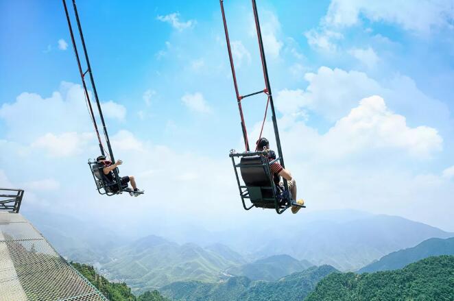 200米的悬崖顶荡秋千,秋千高度有4米、8米、18米。通过机械助推,将秋千拉升直至水平然后放下,挑战心魄。