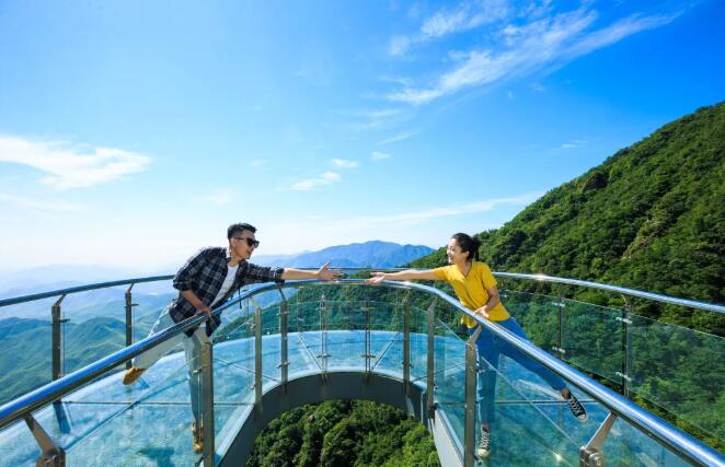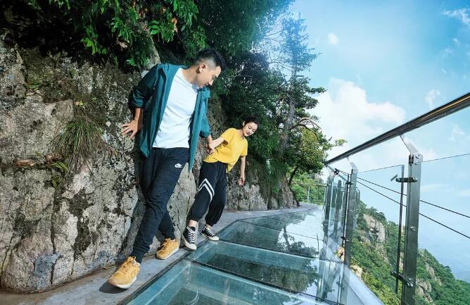 在1000多米海拔的悬崖峭壁之上,依攀山崖蜿蜒100米的玻璃栈道,踏云破雾。