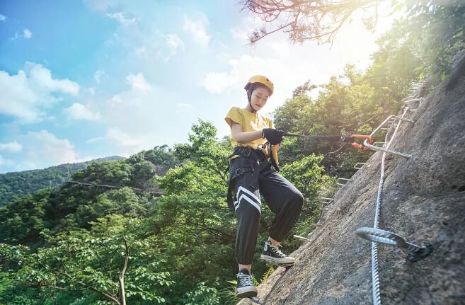 由铁扶手横梯、固定缆索、岩石塞、踏脚垫等构成的爬山径道,普通人也能驰骋悬崖,览众山小。
