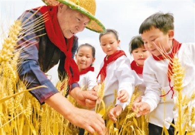 江苏省海安市墩头镇小学生在田间听农民伯伯讲解小麦种植知识。周 强摄(人民视觉)