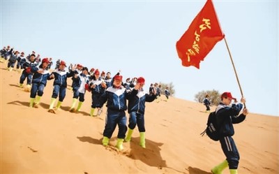 宁夏回族自治区固原市第二中学学生在腾格里沙漠开展徒步沙漠体验,增强了解自然、亲近自然、保护自然的意识。袁宏彦摄(人民图片)