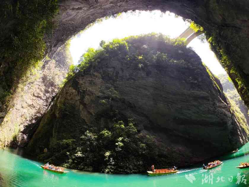 鹤峰县屏山大峡谷,因山侧屏立而得名。峡谷底部碧蓝如镜的河水,随着裂缝中照进来的光束,在水底投射出船影,宛若悬浮,独特而绝美,让人一秒入画。