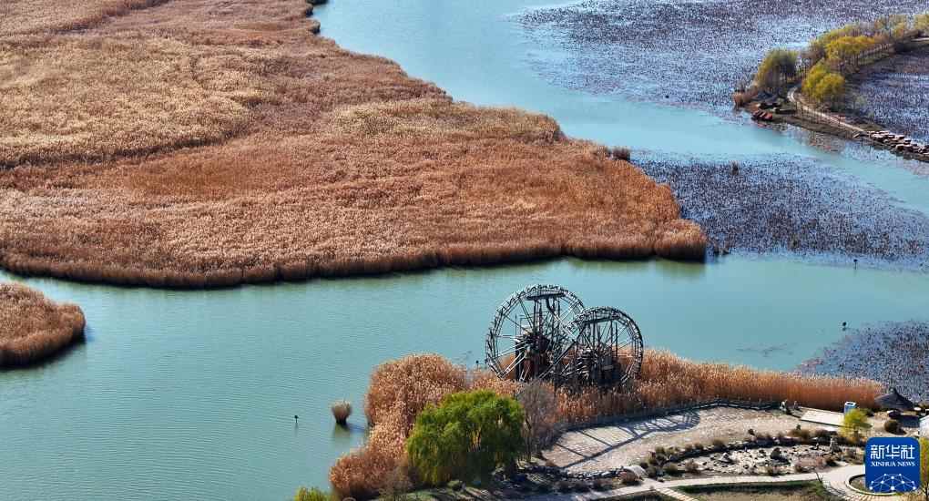 立冬节气过后,位于宁夏银川市兴庆区的鸣翠湖国家湿地公园,金黄色的芦苇随风飘荡,各色林木五彩斑斓,构成独特的初冬湿地景观。