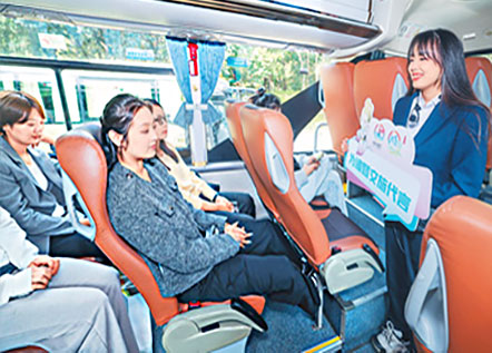 参加浙江省诸暨市“金牌推荐官”导游培训的学员在旅游巴士上进行模拟带团互动。