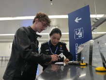 12月17日,北京大兴国际机场,俄罗斯籍旅客伊戈尔和玛丽娜获悉过境免签新政策,规划起新行程。(北京大兴机场边检站供图)