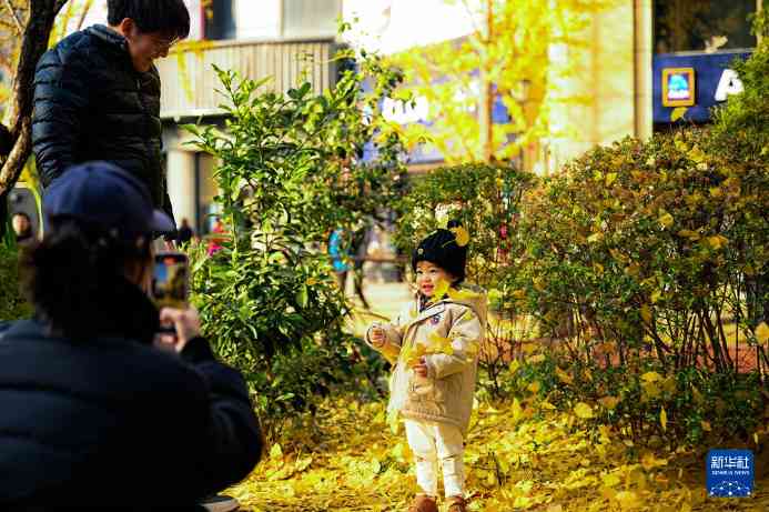 12月14日,游客在上海市长宁区黄金城道步行街拍照。近期,上海迎来银杏最佳观赏期。银杏披上“金黄”的外衣绚烂夺目,吸引市民和游客拍照打卡。
