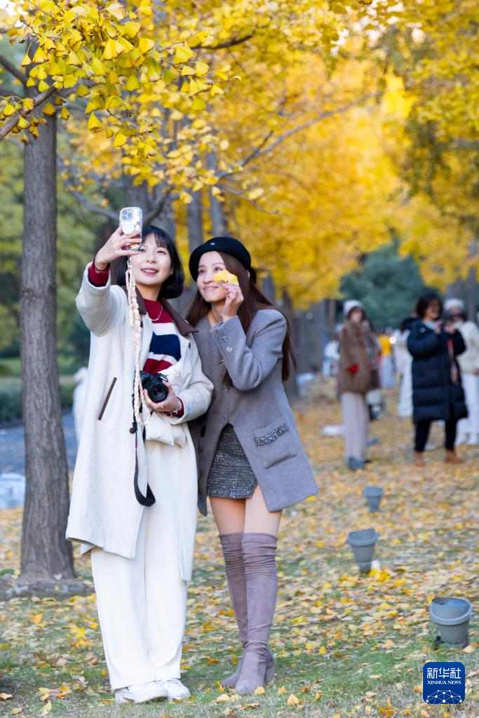 12月15日,市民在上海国际舞蹈中心附近留影。近期,上海迎来银杏最佳观赏期。银杏披上“金黄”的外衣绚烂夺目,吸引市民和游客拍照打卡。