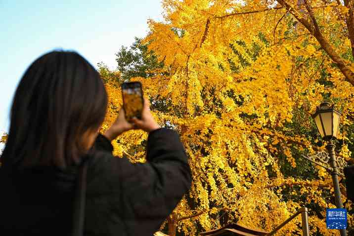 12月15日,市民在上海国际舞蹈中心附近拍照。近期,上海迎来银杏最佳观赏期。银杏披上“金黄”的外衣绚烂夺目,吸引市民和游客拍照打卡。
