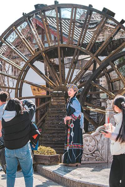 游客在云南丽江古城身穿纳西族服饰拍照留念。和珍浩摄