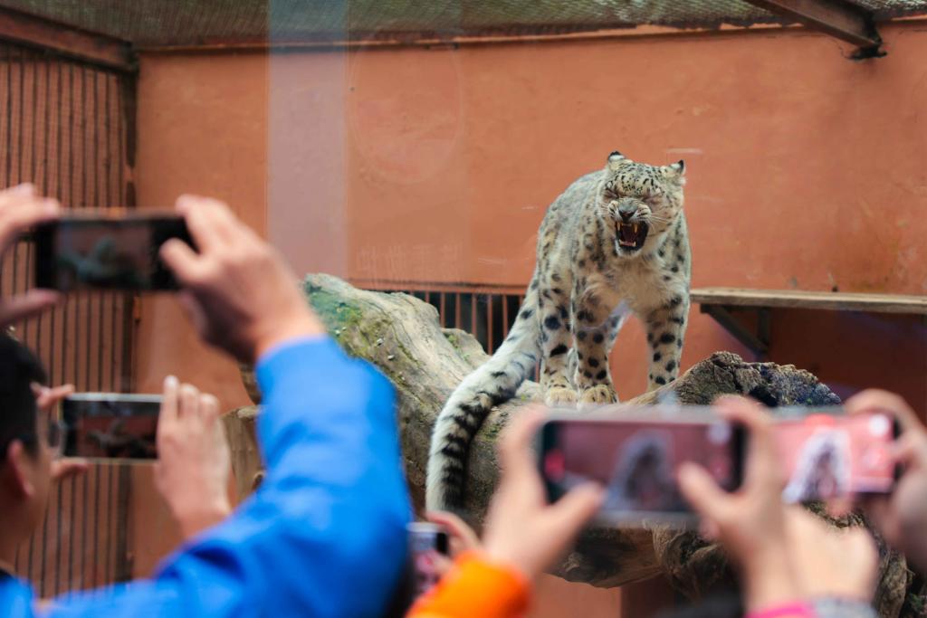 在青海省西宁市西宁野生动物园,游客正在拍摄雪豹“凌夏”。