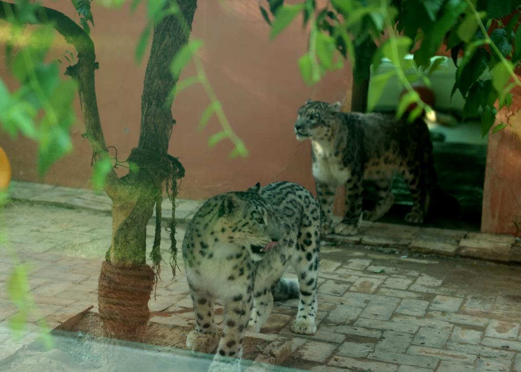在青海省西宁市西宁野生动物园,雪豹“亮亮”“凌夏”在展馆内活动。