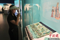 7月16日,四川成都,参观者拍摄珠绣凤穿牡丹绿湖绉帐檐。当日,“青·韵——文物里的中国传统色彩美学”特展在成都金沙遗址博物馆启幕。此次展览汇聚了故宫博物院、湖南博物院等20余家文博机构的200余件/组青色系文物,尽显文物里的青色之美。中新社记者 王磊 摄