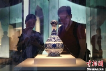 7月16日,四川成都,参观者观看乾隆款青花天球瓶。当日,“青·韵——文物里的中国传统色彩美学”特展在成都金沙遗址博物馆启幕。此次展览汇聚了故宫博物院、湖南博物院等20余家文博机构的200余件/组青色系文物,尽显文物里的青色之美。中新社记者 王磊 摄