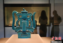 7月16日,四川成都,展出的清代蓝釉堆塑寿字形盖壶。当日,“青·韵——文物里的中国传统色彩美学”特展在成都金沙遗址博物馆启幕。此次展览汇聚了故宫博物院、湖南博物院等20余家文博机构的200余件/组青色系文物,尽显文物里的青色之美。中新社记者 王磊 摄