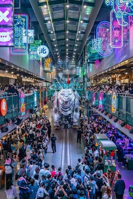 熊洞街是一个由4800平方米废弃工业厂房改造的沉浸式IP乐园,乐园里有巨兽巡游、时尚文创、科技研学、特色美食等元素,用文化、科技、艺术结合的方式,打造了一个“尖叫地标”,并通过“巨熊北北”这个超级IP,把文旅和商业业态有机融合在一起。