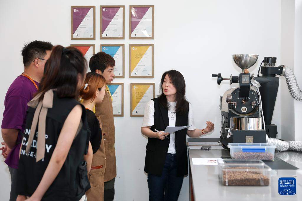 在某咖啡培训学校,咖啡烘焙师为学员讲解咖啡烘焙技巧(5月22日摄)。