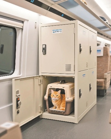 二是全程独立存放,实行人宠分开。每趟列车设置一组用于存放宠物运输箱的高铁快运柜,一般位于中部车厢的一端,与旅客乘车空间相对隔离。工作人员全程不开箱,确保车内环境良好和宠物安全。