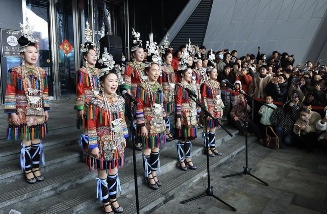 舞乐蝉歌乐团在贵阳市越界影城IMAX未来方舟店演唱侗族大歌。张晖 摄(贵州图片库发)
