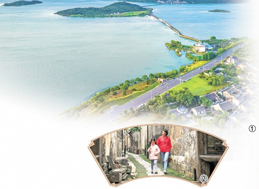 图①:太湖畔的东村。图②:村民行走在东村栖贤巷。图①②均为金庭镇政府提供