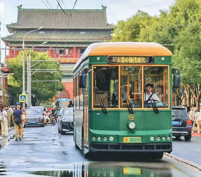 “铛铛铛……”司机轻踩踏板,电车缓缓行进,车窗外的正阳门城楼在蓝天的映衬下更显雍容——在北京市前门大街,深绿色的仿古铛铛车既是备受游客欢迎的“必打卡项目”,又是一道流动的风景。这种复古风格的观光巴士,按照1924年北京驶出的第一辆有轨电车1∶1还原,平缓地穿行于前门、故宫、景山、后海、长安街等区域,让游客在北京这座“高速运转”的繁华都市里,悠闲地欣赏方正有序的城市格局和历史厚重的京味文化。