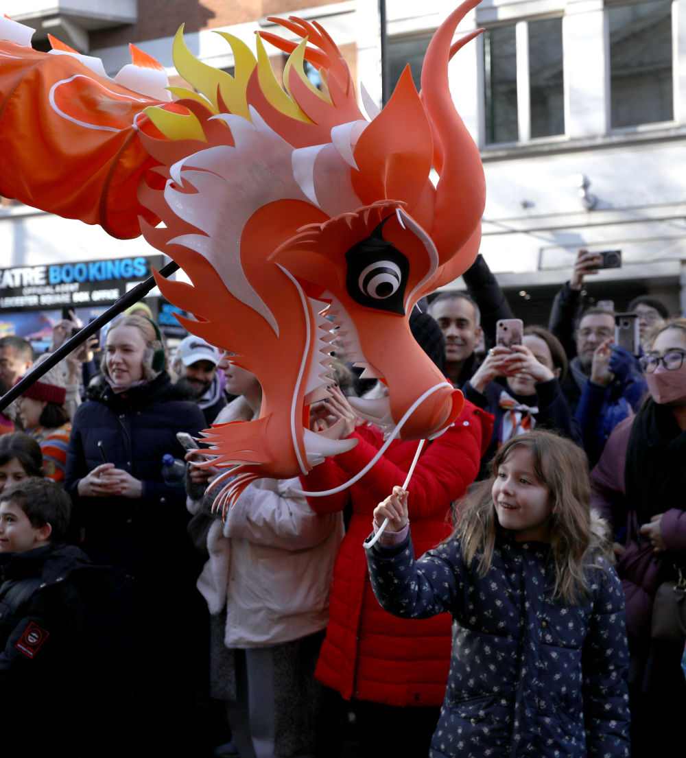 2025年2月2日,一名女孩在英国伦敦举行的新春巡游活动上与“中国龙”互动。李颖 摄